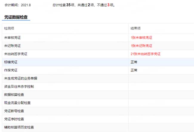 通過數(shù)據(jù)檢查,沒有問題的在結(jié)果項中顯示【正?!浚绻麤]有通過的,在結(jié)果項中會列示出有多少憑證存在異常,并且是紅色提示,點擊紅色提示,就可以聯(lián)查到具體的記錄,然后在對應(yīng)的界面進(jìn)行審核或者記賬造成即可。