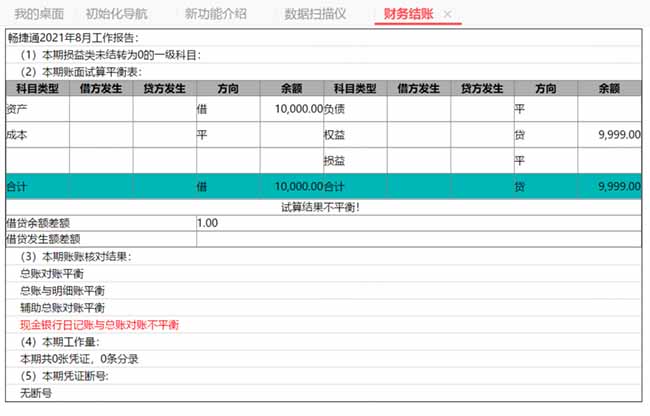 下面截圖檢查結(jié)果顯示期末試算不平衡,點擊【查看】,展示的是當(dāng)月的月度工作報告,可以具體顯示當(dāng)月科目的借方、貸方發(fā)生情況以及余額情況,并且提示試算結(jié)果是否平衡。對于不平衡的,在下面的【本期賬賬對核對結(jié)果】里會顯示具體哪一項不平,然后再根據(jù)實際情況進(jìn)行調(diào)整。