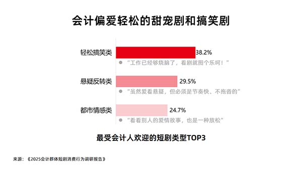 經(jīng)過一天與數(shù)字、報表的“斗智斗勇”,會計人們最需要的是什么?答案可能出乎你的意料——是徹底的大腦放松!調研結果顯示,會計人在短劇題材選擇上表現(xiàn)出明顯的“反職場”傾向。