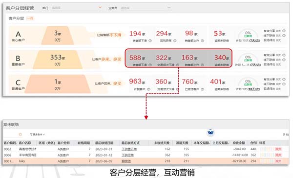 根據(jù)客戶活躍狀態(tài)數(shù)據(jù),自動進(jìn)行客戶分層,幫助老板掌握客戶結(jié)構(gòu)狀態(tài),為客戶運(yùn)營指明方向。