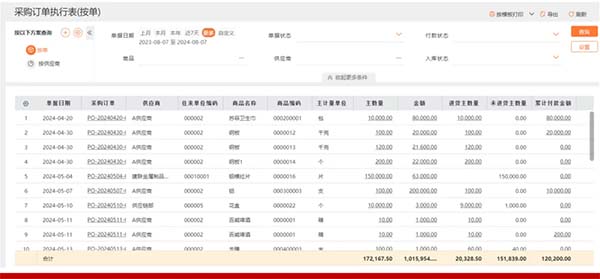 根據(jù)跟供應(yīng)商的采購合同,一次性或者分批進貨入庫,實時查看訂了多少貨-入庫了多少貨-票收了多少-錢付了多少,還有多少貨、錢、票是未執(zhí)行的,是否入庫?是否收票?合同金額?已付金額、未付金額到底是多少?