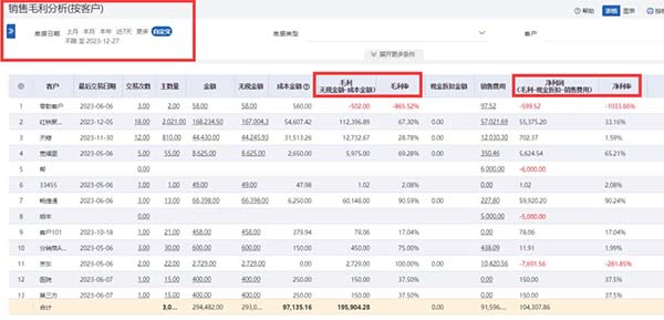 通過后臺(tái)可以清楚地知道交易次數(shù)、銷售金額、無稅金額、成本金額、毛利潤(rùn)、凈利潤(rùn)等,一張圖就能清晰知道每個(gè)客戶給公司帶來了多少毛利、多少凈利。
