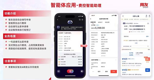 可以直接通過“智友”發(fā)起商旅申請,“智能商旅助理“即可根據(jù)出行政策、預(yù)算標準、個人偏好等,智能推薦最優(yōu)行程方案,并自動完成機票、酒店預(yù)訂。差旅結(jié)束后,將自動審核差旅費用是否符合企業(yè)政策,根據(jù)合規(guī)結(jié)果和預(yù)算自動完成審批,全流程智能化、無紙化,真正實現(xiàn)“說走就走,無需后顧之憂”的智能商旅體驗。