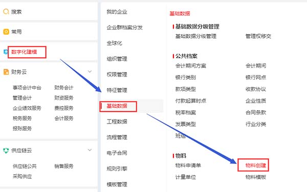 1. 先創(chuàng)建物料:操作路徑: 數(shù)字化建模 > 基礎(chǔ)數(shù)據(jù) > 物料 > 物料創(chuàng)建
