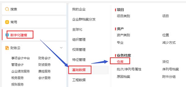 具體操作如下: 路徑:數(shù)字化建模 > 基礎(chǔ)數(shù)據(jù) > 業(yè)務(wù)檔案 > 倉庫