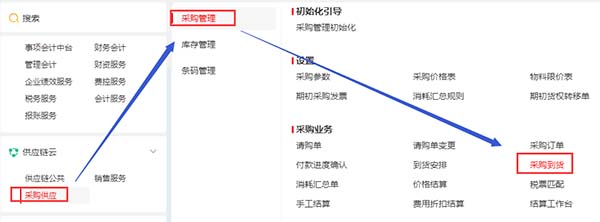 4. 采購到貨參照采購訂單。操作路徑:供應(yīng)鏈云 > 采購供應(yīng) > 采購管理 > 采購業(yè)務(wù) > 采購到貨