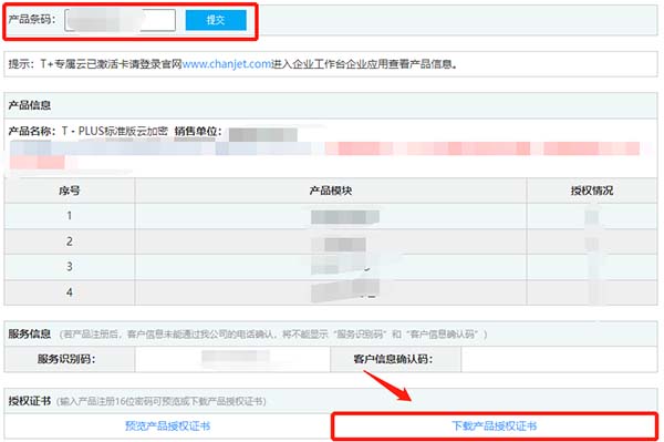 2、接著在如下界面錄入【產(chǎn)品條碼】,即產(chǎn)品卡號,錄入完畢后點擊提交,在下方更新的產(chǎn)品信息中再點擊【下載產(chǎn)品授權(quán)證書】;