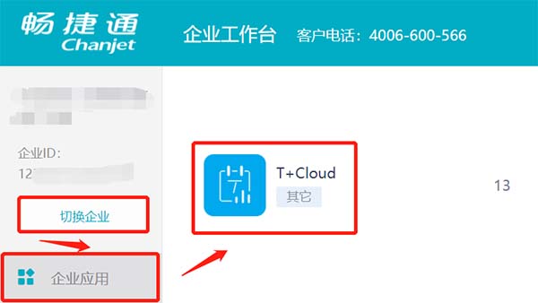 2、跳轉(zhuǎn)到企業(yè)工作臺后,通過【切換企業(yè)】選擇下單購買T+專屬云\T+CLOUD的云企業(yè),再點擊【企業(yè)應(yīng)用】,找到T+專屬云\T+Cloud應(yīng)用,點擊應(yīng)用跳轉(zhuǎn)到詳情界面;