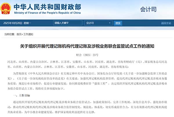 據(jù)石家莊用友了解,10月17日,財(cái)政部與國(guó)家稅務(wù)總局聯(lián)合發(fā)布《關(guān)于組織開(kāi)展代理記賬機(jī)構(gòu)代理記賬及涉稅業(yè)務(wù)聯(lián)合監(jiān)管試點(diǎn)工作的通知》(財(cái)會(huì)〔2025〕23號(hào)),決定在河北、內(nèi)蒙古、江蘇等10個(gè)省份開(kāi)展代理記賬機(jī)構(gòu)聯(lián)合監(jiān)管試點(diǎn)。