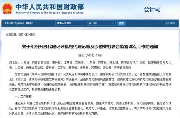 近期,財政部、稅務(wù)總局聯(lián)合印發(fā)了《關(guān)于組織開展代理記賬機構(gòu)代理記賬及涉稅業(yè)務(wù)聯(lián)合監(jiān)管試點工作的通知》(財會〔2025〕23號),并在10個省份正式開展代理記賬機構(gòu)聯(lián)合監(jiān)管試點。