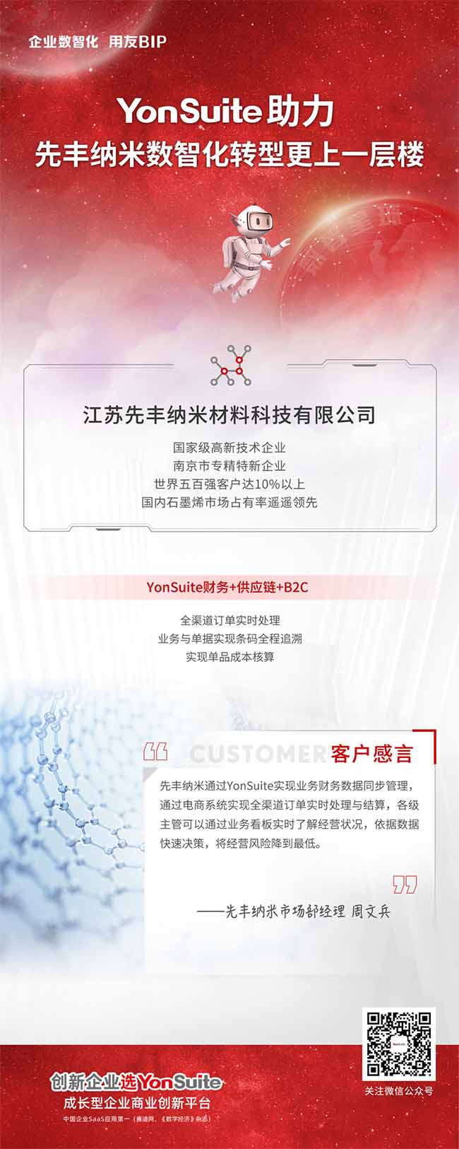 江蘇先豐納米是國家級高新技術(shù)企業(yè),有自己的銷售平臺和渠道。用友YonSuite接收多方平臺傳入的數(shù)據(jù)生成銷售訂單,進(jìn)行安排生產(chǎn)入庫、發(fā)貨、出庫、開票、收款等全流程處理,集業(yè)財一體化、產(chǎn)供銷一體化的平臺優(yōu)勢助力先豐納米數(shù)智化轉(zhuǎn)型更上一層樓。