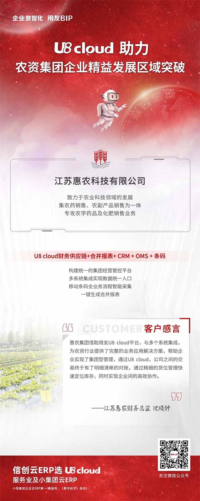 “惠農(nóng)ERP數(shù)智信息化”項目從規(guī)劃到建設(shè),用友U8 cloud僅用了半年時間實(shí)現(xiàn)了ERP和 CRM雙系統(tǒng)上線,ERP與OMS系統(tǒng)和條碼系統(tǒng)的集成管理, 對處于企業(yè)信息化管理階段的江蘇惠農(nóng)和類似農(nóng)資行業(yè)客戶探索數(shù)智化,更具有非凡的里程碑意義和參考價值。
