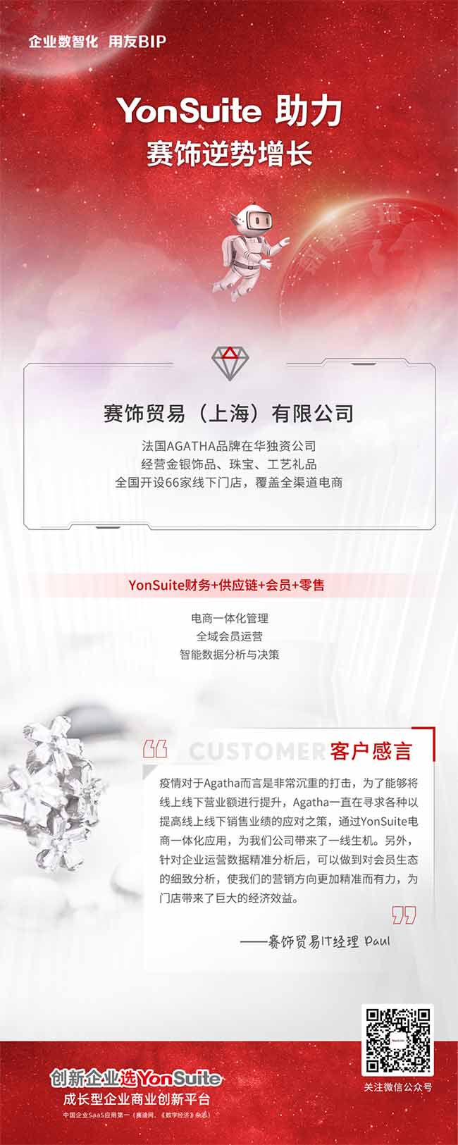 Agatha 想要盡快恢復(fù)門店業(yè)績(jī),需要盡快升級(jí)傳統(tǒng)的營(yíng)銷模式,轉(zhuǎn)為以“數(shù)據(jù)”為主導(dǎo)的數(shù)字化運(yùn)營(yíng)模式,通過(guò) 用友YonSuite 會(huì)員精細(xì)化運(yùn)營(yíng),針對(duì)不同顧客進(jìn)行針對(duì)性營(yíng)銷,提升營(yíng)銷效率。他們從與 YonSuite 攜手過(guò)程中探索出門店智慧運(yùn)營(yíng)的管理新模式,化解了企業(yè)危機(jī)。