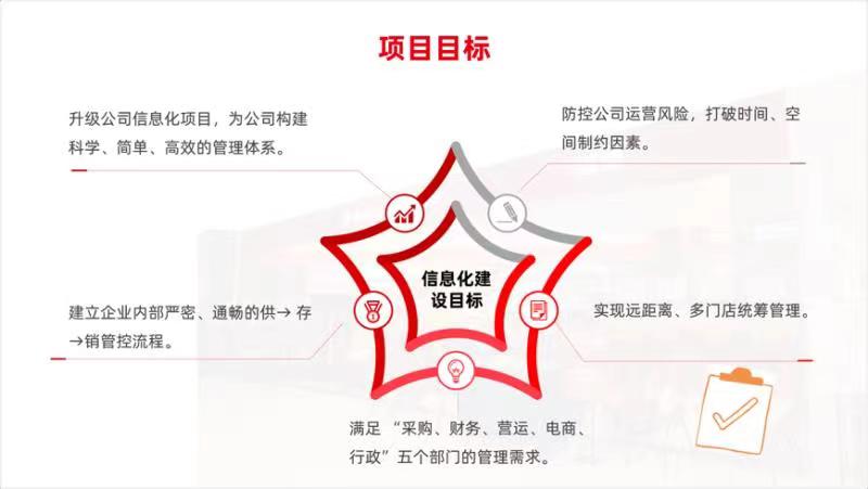 在這樣的窘境下,付國銀對(duì)企業(yè)數(shù)智化需求重新進(jìn)行了梳理和盤點(diǎn),并制定了五大建設(shè)目標(biāo),即通過數(shù)智化平臺(tái)的建設(shè),滿足采購、財(cái)務(wù)、電商、行政等部門管理訴求;規(guī)范業(yè)務(wù)管理,建立標(biāo)準(zhǔn)化、一體化的供、存、銷管理流程;實(shí)現(xiàn)對(duì)所有門店的集中管控;加強(qiáng)移動(dòng)化應(yīng)用,打造全面高效的決策支持體系,提高管理者的決策效率和準(zhǔn)確率;為企業(yè)構(gòu)建科學(xué)、有效的管理體系。