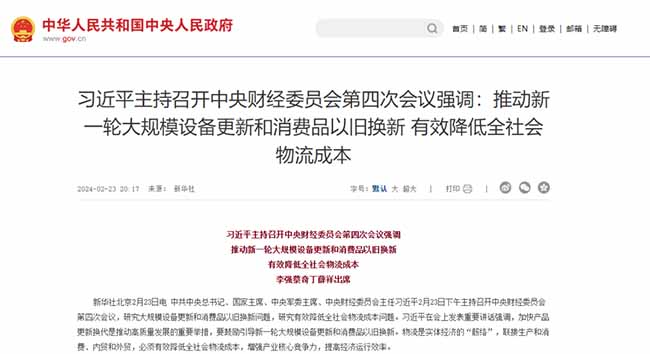 習(xí)近平總書記在中央財(cái)經(jīng)委員會(huì)第四次會(huì)議上發(fā)表重要講話強(qiáng)調(diào),加快產(chǎn)品更新?lián)Q代是推動(dòng)高質(zhì)量發(fā)展的重要舉措,要鼓勵(lì)引導(dǎo)新一輪大規(guī)模設(shè)備更新和消費(fèi)品以舊換新。物流是實(shí)體經(jīng)濟(jì)的“筋絡(luò)”,聯(lián)接生產(chǎn)和消費(fèi)、內(nèi)貿(mào)和外貿(mào),必須有效降低全社會(huì)物流成本,增強(qiáng)產(chǎn)業(yè)核心競(jìng)爭(zhēng)力,提高經(jīng)濟(jì)運(yùn)行效率。