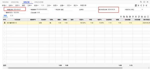 新增采購訂單時,在表頭或表體維護【預(yù)計到貨日期】,采購進貨預(yù)警是對預(yù)計到貨日期進行提前預(yù)警