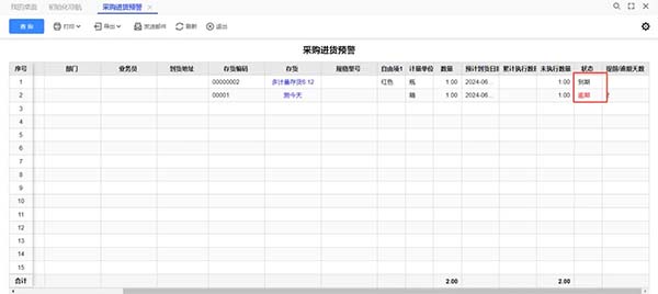 采購到貨預(yù)警提前天數(shù)為兩天,采購人員以6月28日登入軟件,則會彈出相應(yīng)的預(yù)警信息