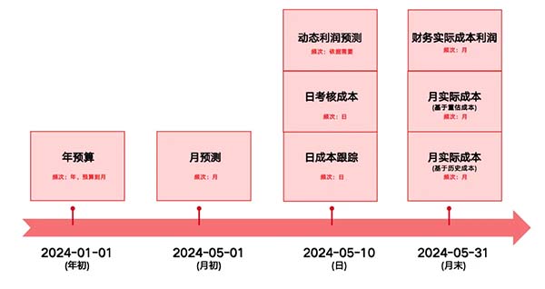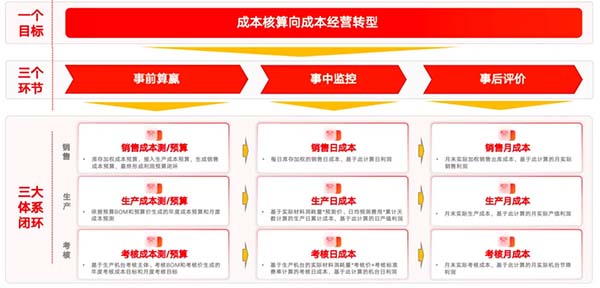 年度預(yù)算落地戰(zhàn)略目標(biāo)和資源優(yōu)化配置,同時(shí)作為各級責(zé)任組織的考核目標(biāo);月度滾動(dòng)預(yù)測跟隨市場波動(dòng)指導(dǎo)生產(chǎn)經(jīng)營;日成本效益核算實(shí)現(xiàn)日級別的實(shí)時(shí)生產(chǎn)經(jīng)營反饋;月度實(shí)際成本利潤核算反饋各級責(zé)任組織的生產(chǎn)經(jīng)營績效,支撐各級責(zé)任組織的敏捷經(jīng)營和精準(zhǔn)決策,助力企業(yè)通過成本經(jīng)營推動(dòng)更多價(jià)值創(chuàng)造。