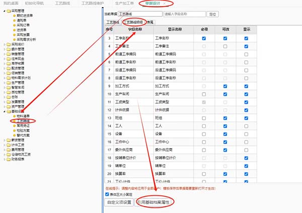 3、系統(tǒng)管理-單據(jù)設計-工藝路線-工藝路線明細,引用基礎檔案屬性。