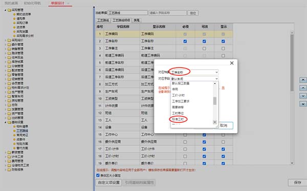 4、點擊【引用基礎檔案屬性】,對應檔案選擇【工序名稱】,對應字段選擇【標準工時】,點擊【確定】,再保存。