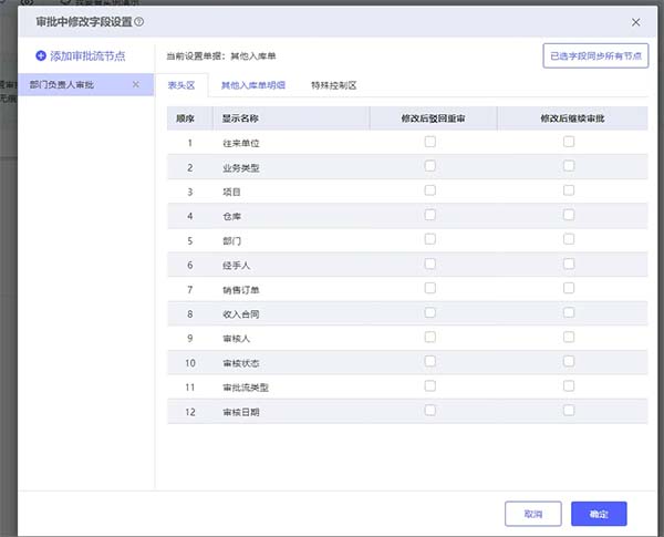 2、根據(jù)審批流節(jié)點(diǎn)設(shè)置審批中可修改字段,根據(jù)表頭區(qū)、明細(xì)區(qū)的字段設(shè)置可設(shè)置內(nèi)容:駁回重審、繼續(xù)審核