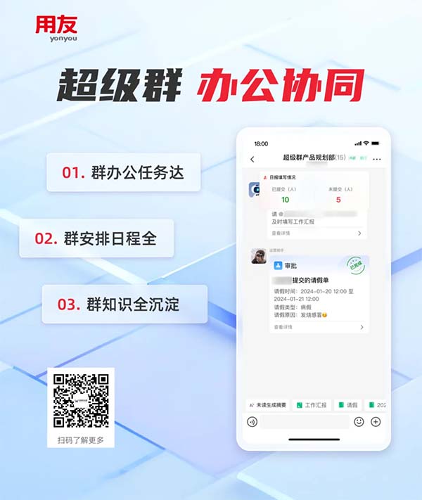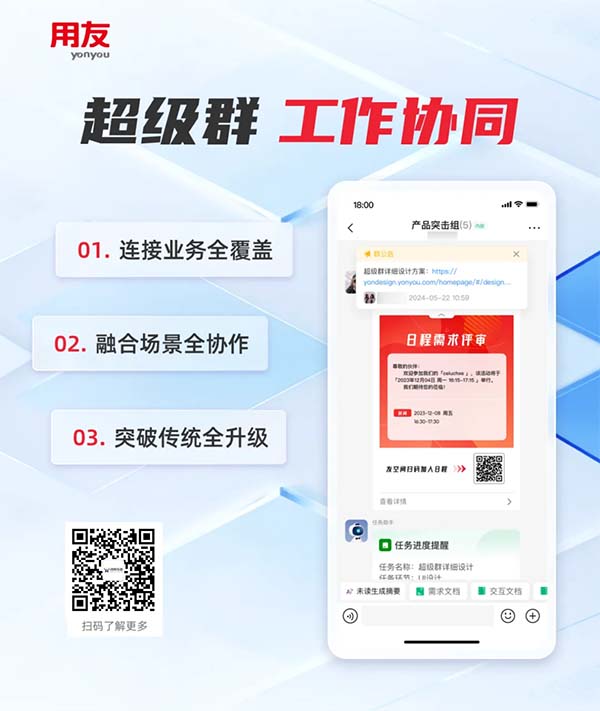 在快速變化的商業(yè)環(huán)境中,高效、靈活、全面的協(xié)同工作已成為企業(yè)提升競爭力的關(guān)鍵。用友友空間推出的全新“超級群”功能,正是為了滿足現(xiàn)代企業(yè)對于更加智能化、集成化協(xié)同工作的需求。超級群不僅是一個溝通平臺,更是一個集工作、財務(wù)、收付、數(shù)據(jù)、采購、銷售、項目、辦公于一體的全方位協(xié)同中心,旨在打破傳統(tǒng)工作協(xié)同的界限,讓協(xié)作更加順暢,企業(yè)運營更加高效。