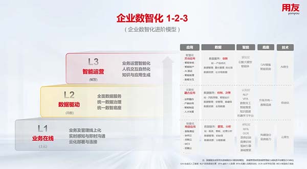 那么企業(yè)如何正確、成功推進數(shù)智化?用友總結(jié)服務(wù)眾多行業(yè)不同規(guī)模企業(yè)的數(shù)智化實踐,提出了“企業(yè)數(shù)智化1-2-3”的能力進階模型,企業(yè)通過“業(yè)務(wù)在線、數(shù)據(jù)驅(qū)動、智能運營”三個能力進階成功實現(xiàn)數(shù)智化。企業(yè)要成功推進數(shù)智化,除了要選擇采用正確的方法論、選擇合適的軟件系統(tǒng),企業(yè)還要重視和做好“數(shù)據(jù)治理”(數(shù)據(jù)標(biāo)準化)、“模型運用”(AI模型的選擇和應(yīng)用)這兩項重要的基礎(chǔ)工作,就像信息化時期要做好“流程梳理”工作一樣。