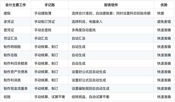 相比于手工記賬,財(cái)務(wù)系統(tǒng)將紙質(zhì)化搬到了電腦上,替代大部分人工核算工作,提高了效率、準(zhǔn)確度。區(qū)別如下表: