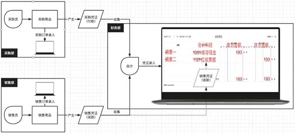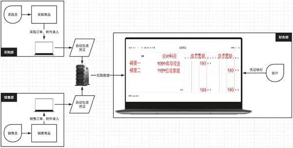 在上圖中,采購(gòu)(銷售)人員采購(gòu)(銷售)完成后,將數(shù)據(jù)錄入到業(yè)務(wù)系統(tǒng)中,同時(shí)自動(dòng)生成憑證,將業(yè)務(wù)數(shù)據(jù)同步到財(cái)務(wù)系統(tǒng)中;財(cái)務(wù)不需要手動(dòng)轉(zhuǎn)化原始憑證并錄入。