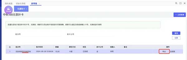 (2)在【批量制卡界面】,點(diǎn)擊【導(dǎo)出】制卡信息,可以導(dǎo)出這一批的【卡號(hào)+兌換碼】,可以交給印刷廠制作實(shí)體卡片