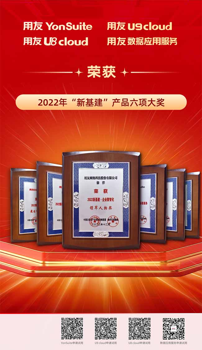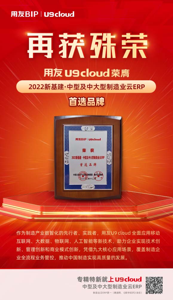 用友U9 cloud榮獲“2022新基建·中型及中大型制造業(yè)云ERP首選品牌”及“2022新基建·專(zhuān)精特新最佳解決方案獎(jiǎng)”