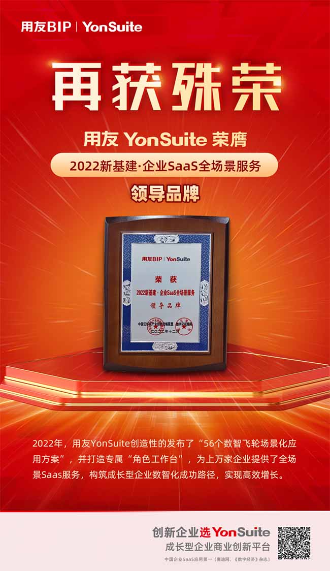 本次評(píng)選用友YonSuite榮獲“2022新基建·企業(yè)SaaS全場(chǎng)景服務(wù)領(lǐng)導(dǎo)品牌”,以實(shí)力引領(lǐng)創(chuàng)新,以技術(shù)領(lǐng)先性和創(chuàng)新性驅(qū)動(dòng)企業(yè)高效增長(zhǎng),領(lǐng)跑中國(guó)SaaS產(chǎn)業(yè)發(fā)展。