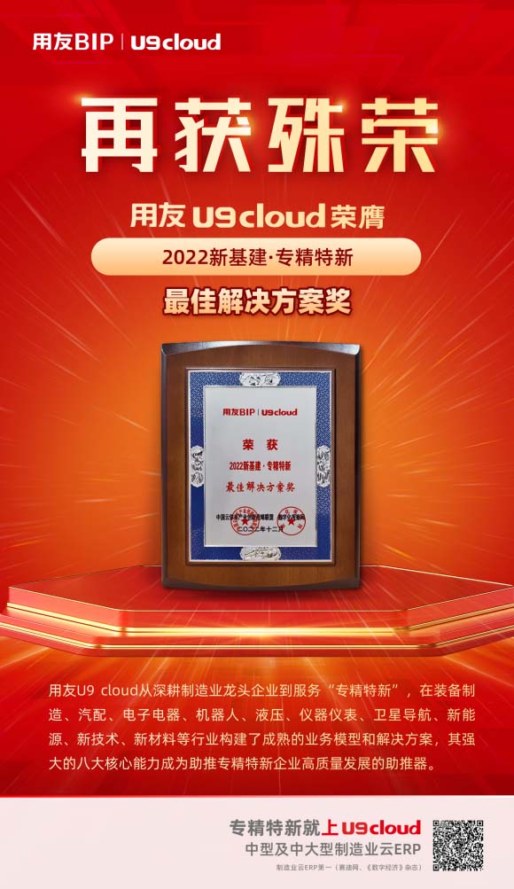 用友U9 cloud榮獲“2022新基建·中型及中大型制造業(yè)云ERP首選品牌”及“2022新基建·專(zhuān)精特新最佳解決方案獎(jiǎng)”兩項(xiàng)表彰。