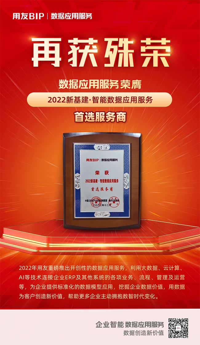 用友數(shù)據(jù)應(yīng)用服務(wù)憑借著先進(jìn)的技術(shù)架構(gòu)、創(chuàng)新的應(yīng)用模式和優(yōu)秀的客戶(hù)實(shí)踐,榮獲“2022新基建·智能數(shù)據(jù)應(yīng)用服務(wù)首選服務(wù)商”獎(jiǎng)項(xiàng)。
